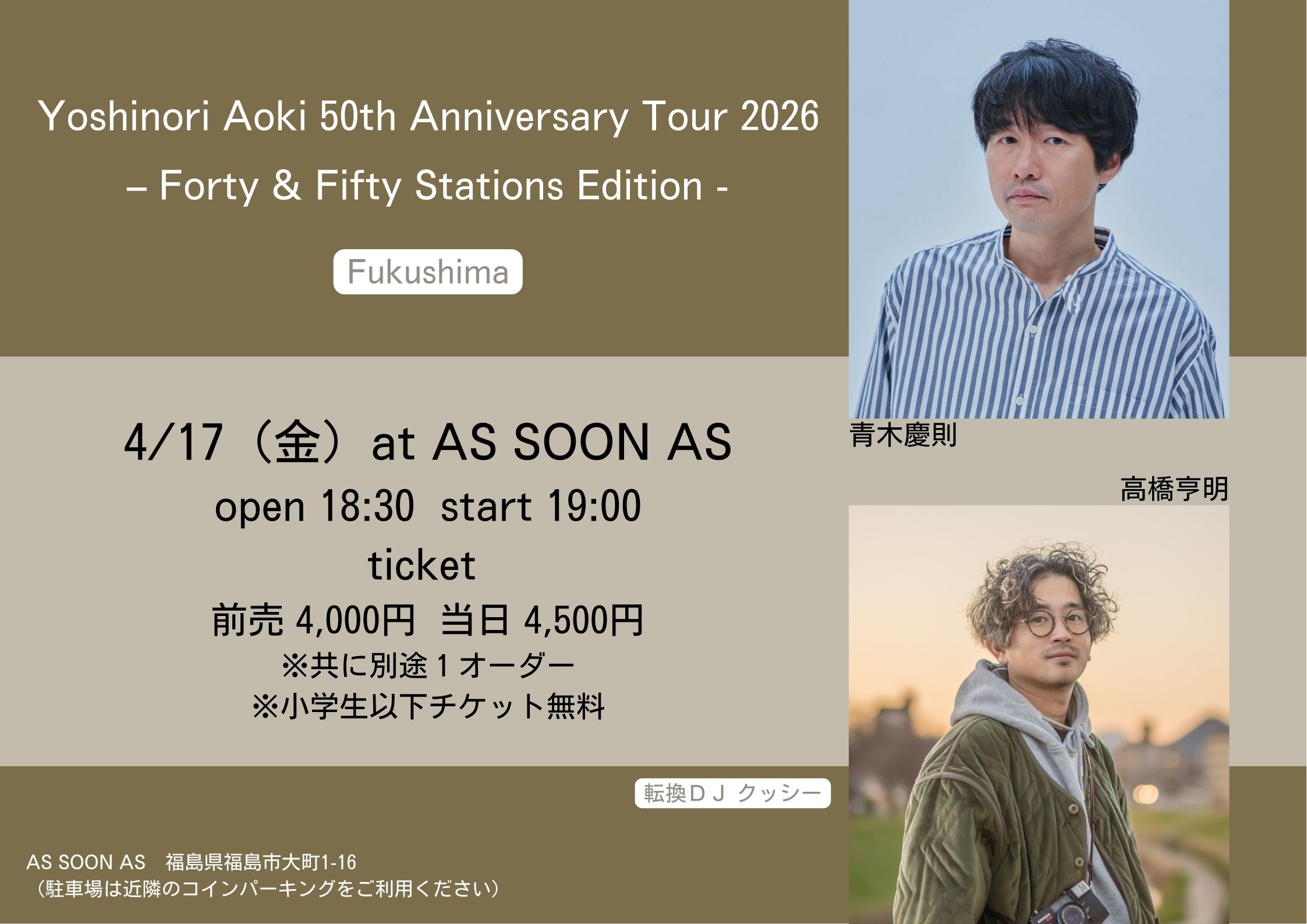 スタートは東北から。仙台在住のシンガーソングライター・高橋亨明 (ex.@なおポップ)くんとのスプリットツアーです。ちょうど亨明くんが40歳、僕が50歳でまわるツアーなので、このタイトルになりました。