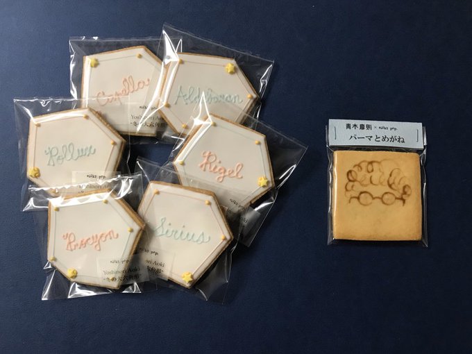 続いて、今回は初めての試みとして、milky pop. によるクッキーをご用意しました。こちらは数に限りがありますのでご注意ください。「冬の大六角形」クッキー(500円)は、実際の6つの星の名前をアイシングで描いてもらいました。「パーマとめがね」クッキー(300円)は、今の僕のことですね。今年の夏に20年ぶりにパーマをかけ、同時にメガネもかけるようになりました。